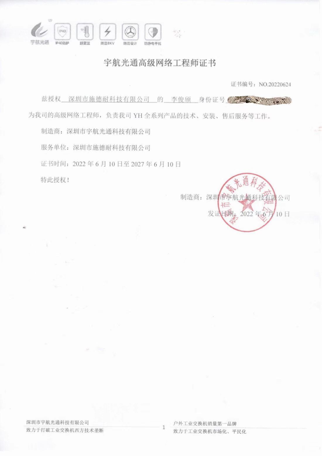 宇航光通高級網絡工程師授權書