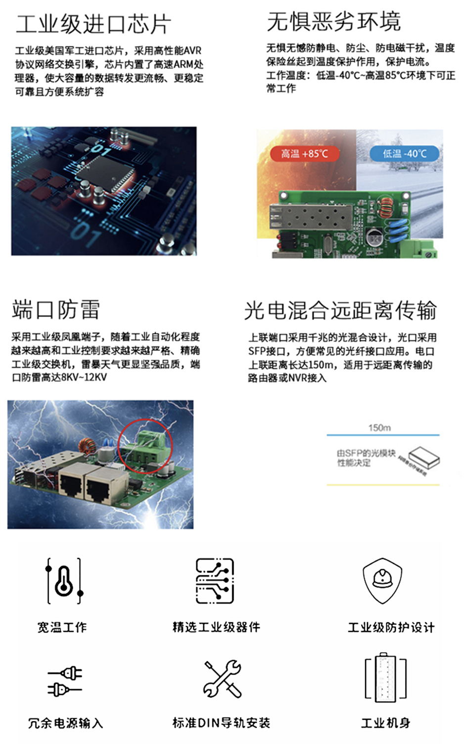 4路百兆電口+2路百兆FX光口工業級以太網交換機,支持4個10Base-T/100Base-TX電口和2個100Base-X光口。產品符合FCC、CE、ROHS標準。YHR24F系列交換機具有-40℃~85℃的工作溫度,具有超強的堅固度能適應各種嚴苛環境,也可以非常方便的安置在空間緊湊的控制箱中。導軌的安裝特性、寬溫操作及擁有IP40防護等級的外殼及LED指示燈,使NT10-IES24FP成為一個即插即用的工業級設備,為用戶的以太網設備聯網提供可靠、便捷的解決方案。