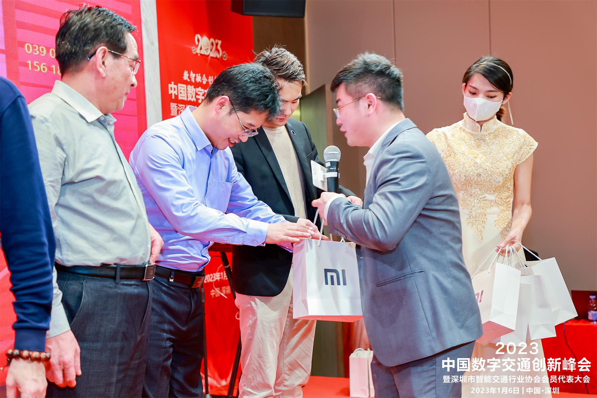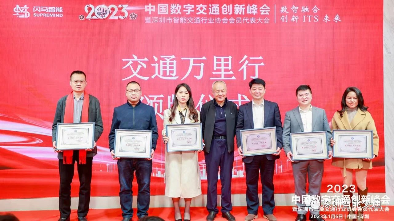 ▲深圳市智能交通行業(yè)協(xié)會(huì)專家委常務(wù)副主任、天地智能交通研究院院長鄧文杰為獲獎(jiǎng)企業(yè)頒獎(jiǎng)并合影