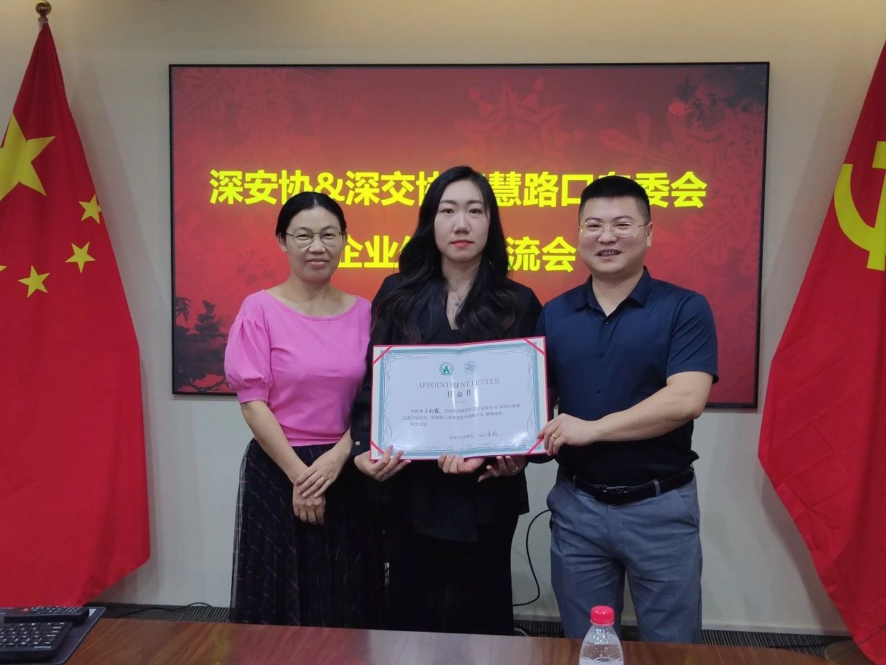 圖為深安協&深交協-智慧路口專委會主任、宇航工業交換機劉偉成和秘書長王小華為深圳市博思高科技有限公司大客戶總監石彩霞頒發智慧路口專委會副秘書長聘書。