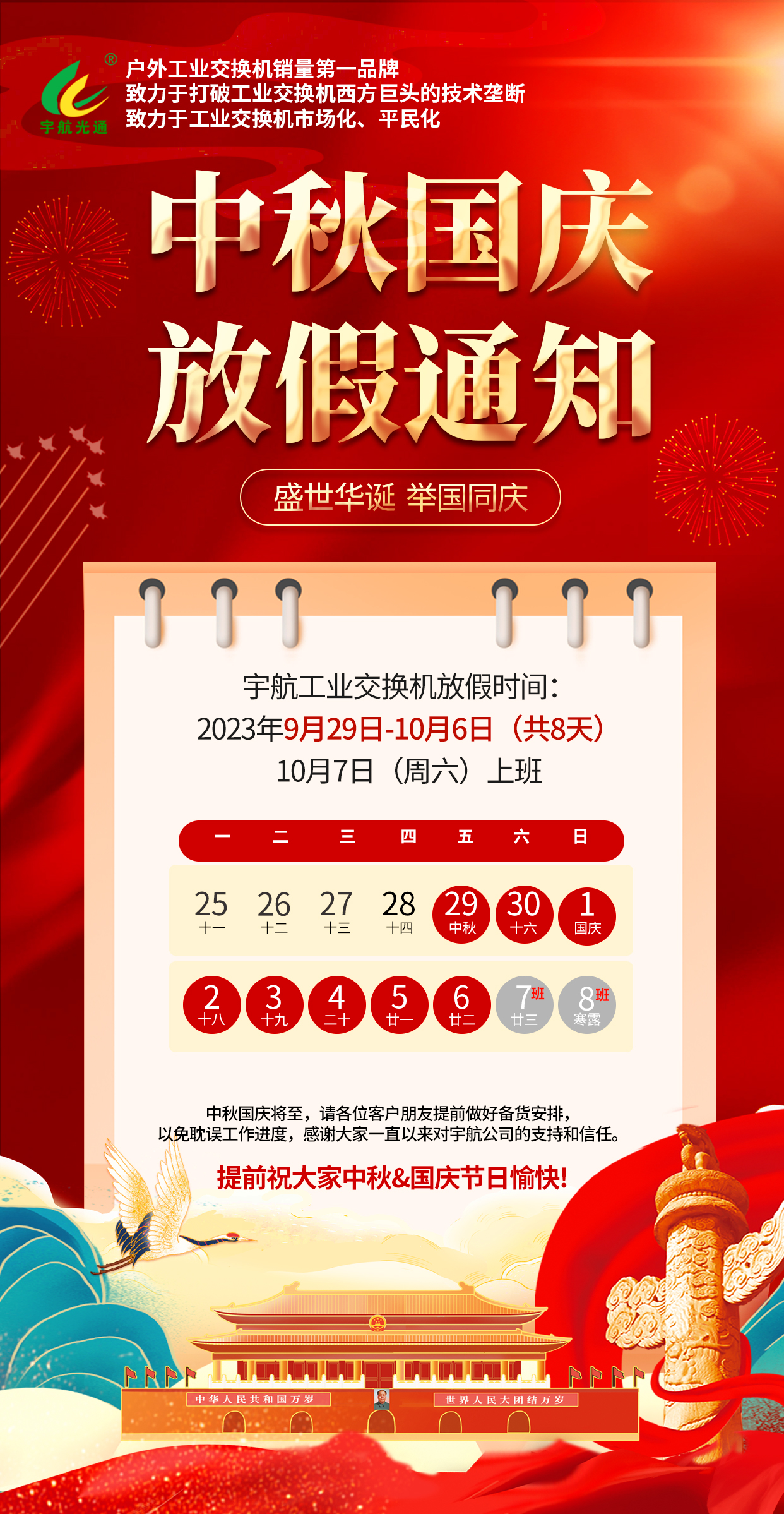 根據(jù)國家法定假期的規(guī)定,宇航工業(yè)交換機(jī)2023年中秋節(jié)、國慶節(jié)放假安排通知如下: