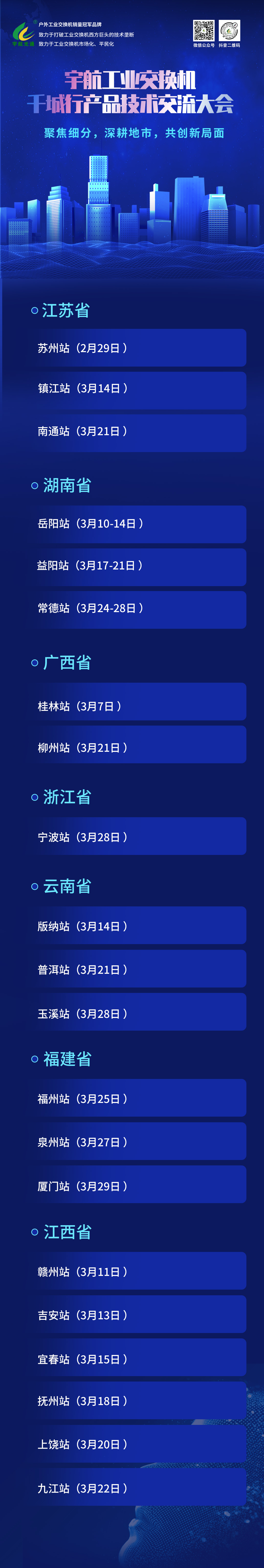 三月,宇航將攜手眾多合作伙伴和宇航全國產(chǎn)工業(yè)交換機,在濟南、西安、鄭州、合肥、武漢等地參展,與各界朋友共襄盛舉。同時,宇航還將深入江蘇、湖南、廣西、浙江、云南、福建、江西等地,舉行宇航工業(yè)交換機千城行產(chǎn)品技術交流大會,助力各行各業(yè)的數(shù)字化轉型,讓數(shù)字化轉型的春風,吹滿神州大地!