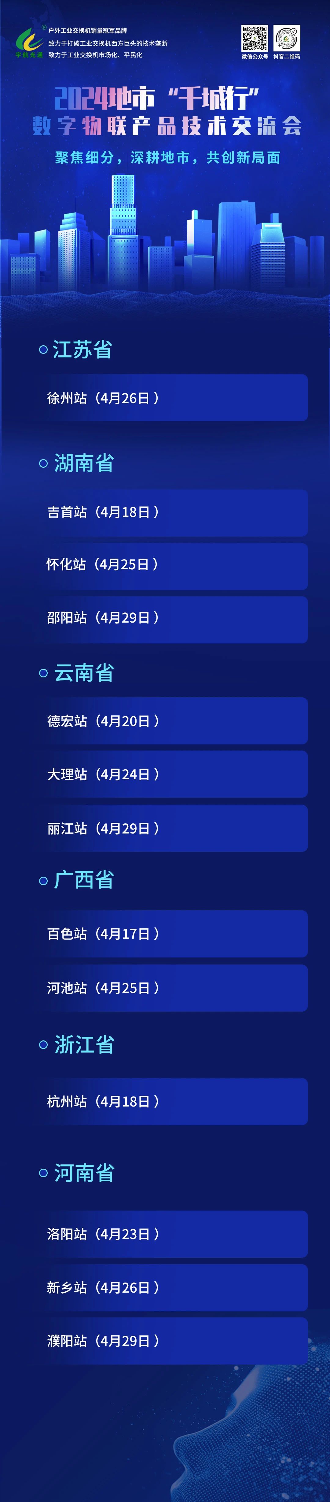 2024宇航工業交換機千城行產品技術交流大會正如火如荼地進行中,4月1日至4月16日,宇航分別在福建漳州、云南臨滄/保山、江蘇徐州、湖南張家界、河南開封等地成功舉辦大會。
