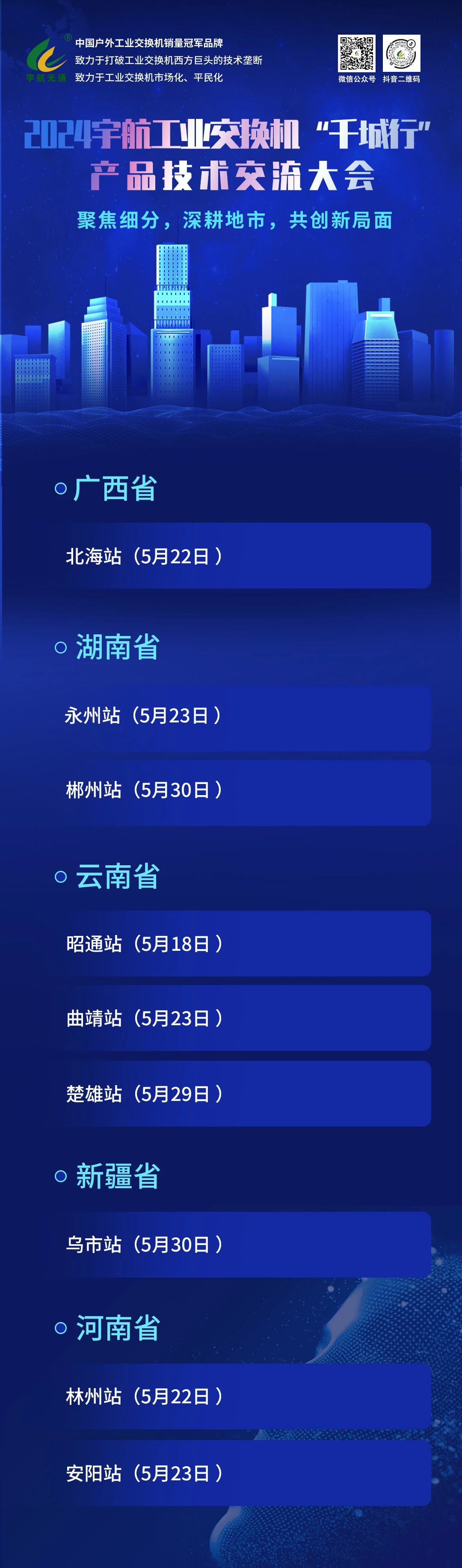 五月中下旬,宇航工業(yè)交換機(jī)繼續(xù)相約與您成都、新疆、山東、北京、湖南(永州、郴州)、廣西北海、云南(昭通、曲靖、楚雄)、河南(林州、安陽)等地市!期待您的蒞臨!