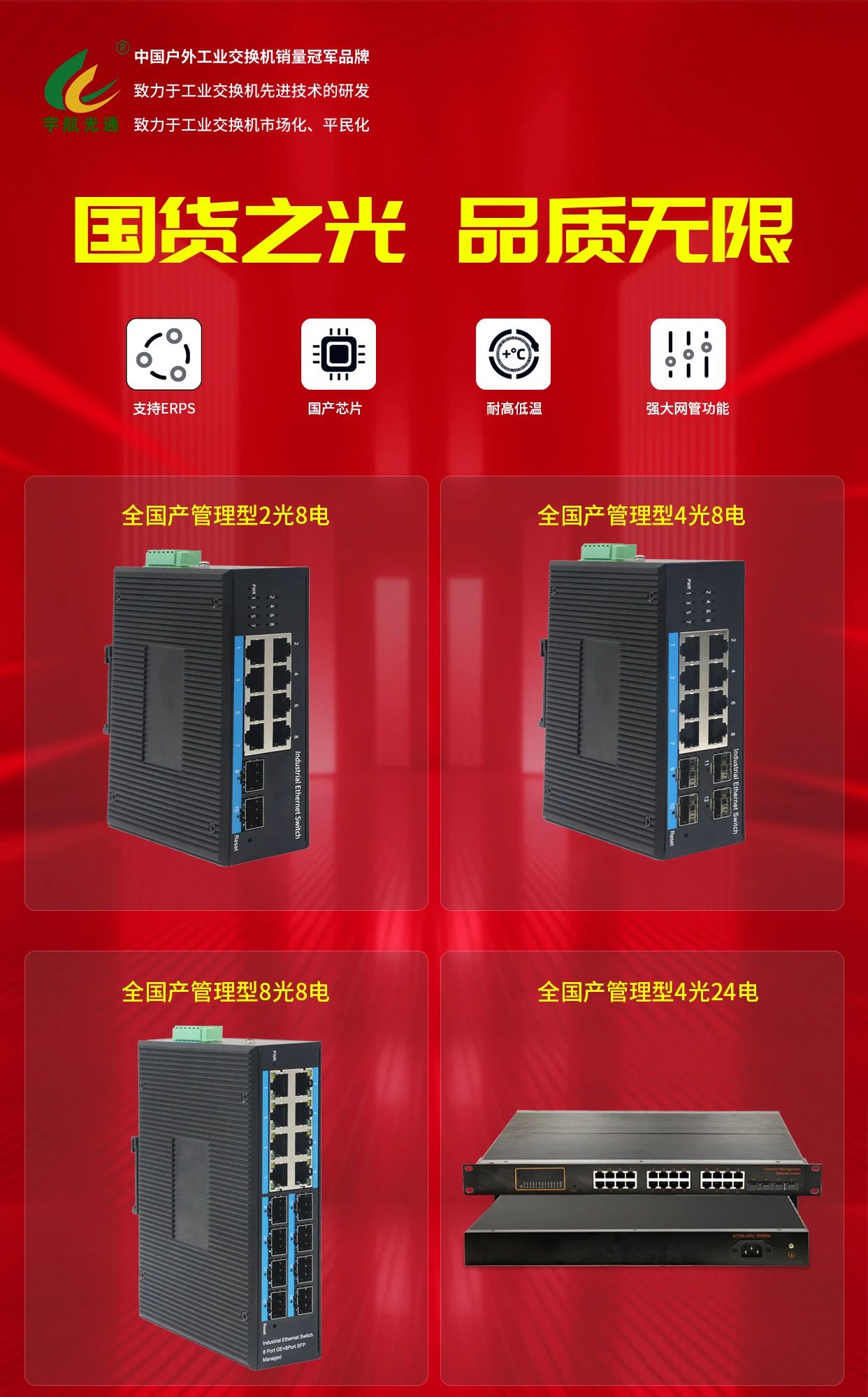 為了更好地服務于市場、服務于客戶,宇航工業交換機又一次重磅發布了全國產工業交換機。此次發布的全國產工業交換機系列,涵蓋了管理型2光8電、4光8電、8光8電、4光24電等多種規格,滿足了工業級網絡設備的全方位需求。這些產品基于全國產芯片設計,從硬件到軟件,完全實現了國產化替代。雖然在性能和功能上與國際頂尖水平仍有一定差距,但這一系列產品的推出,標志著中國在工業交換機領域的國產化進程邁出了堅實的一步,也表明國產化替代的道路正在加速。同時,不僅為中國工業網絡設備領域注入了新的活力,更是國產芯片在工業應用場景中的一次重要突破。