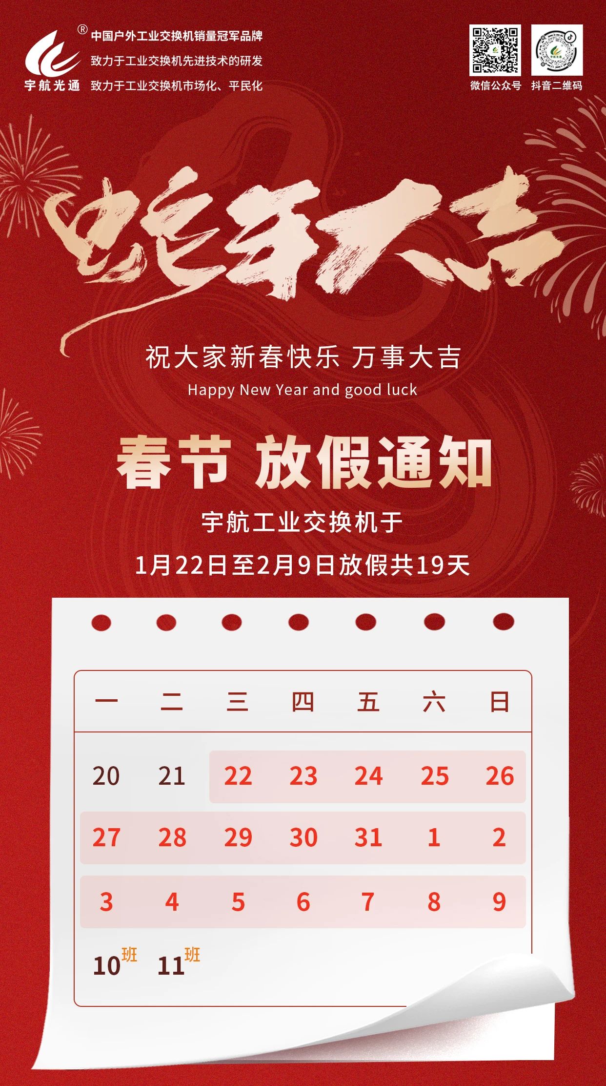 根據國家法定假期的規定,宇航工業交換機2025年春節放假安排通知如下:2025年春節放假時間: 1月22日(農歷臘月廿三)-2月9日(農歷正月十二),共19天。2月10日(周一)上班。