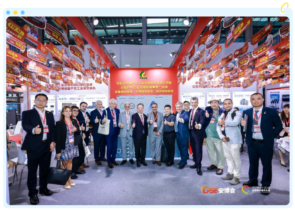 展會期間,我們很榮幸地迎來了中國國際社會公共安全博覽會組委會主席、世界數字城市大會主席、歐洲科學院院士、深安協&深交協創會會長楊金才等全國多地行業協會與機構的領導和專家蒞臨交流。嘉賓們對宇航全系列全國產工業交換機的技術突破與規?;瘧贸晒o予了高度認可,并充分肯定了我們在推動工業網絡自主可控、守護關鍵基礎設施網絡安全方面所做出的努力。這份認可與鼓勵,是我們前行路上最寶貴的動力。在此,向所有關心和支持宇航工業交換機的朋友們致以最誠摯的感謝!
