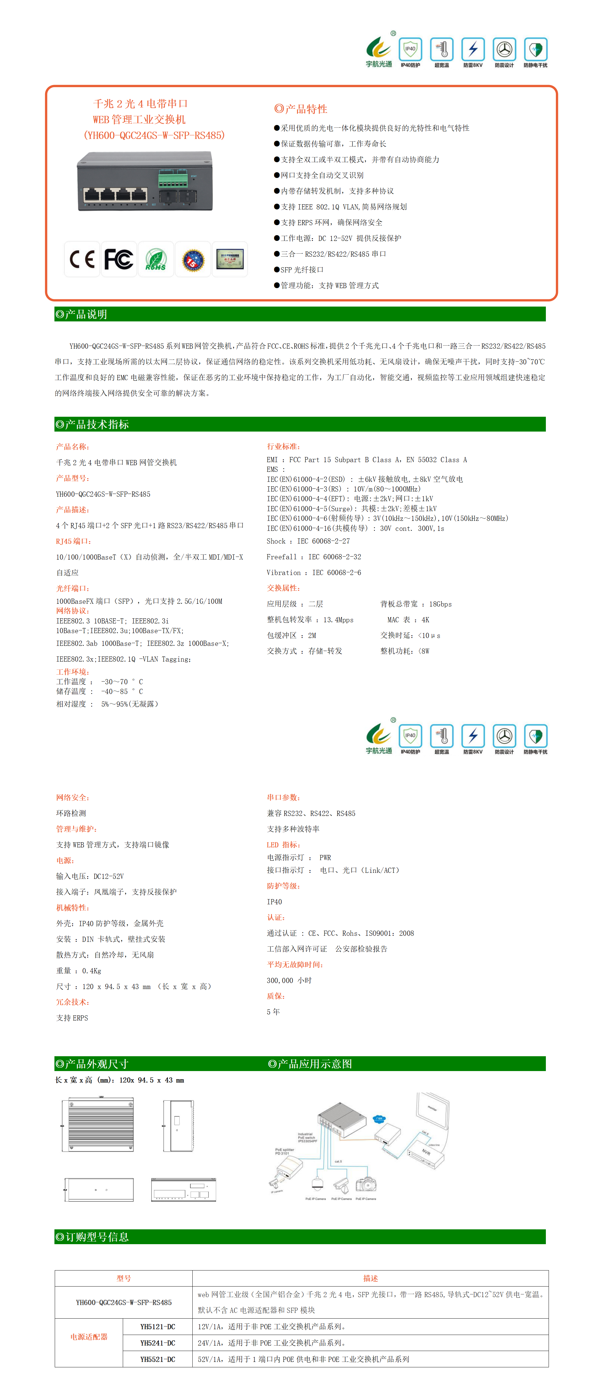 YH600-QGC24GS-W-SFP-RS485系列WEB網(wǎng)管交換機(jī),產(chǎn)品符合FCC、CE、ROHS標(biāo)準(zhǔn),提供2個千兆光口、4個千兆電口和一路三合一RS232/RS422/RS485串口,支持工業(yè)現(xiàn)場所需的以太網(wǎng)二層協(xié)議,保證通信網(wǎng)絡(luò)的穩(wěn)定性。該系列交換機(jī)采用低功耗、無風(fēng)扇設(shè)計,確保無噪聲干擾,同時支持-30~70℃工作溫度和良好的EMC電磁兼容性能,保證在惡劣的工業(yè)環(huán)境中保持穩(wěn)定的工作,為工廠自動化,智能交通,視頻監(jiān)控等工業(yè)應(yīng)用領(lǐng)域組建快速穩(wěn)定的網(wǎng)絡(luò)終端接入網(wǎng)絡(luò)提供安全可靠的解決方案。