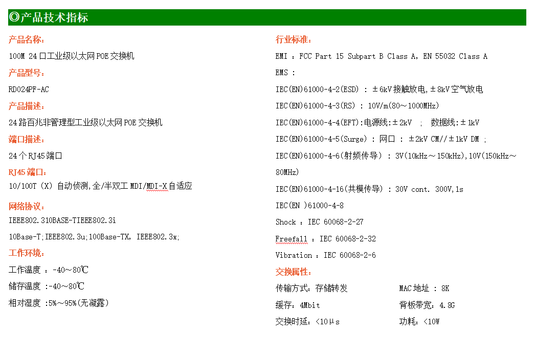 24路百兆電口工業級以太網交換機,支持24個10Base-T/100Base-TX電口。產品符合FCC、CE、ROHS標準。RD024F交換機具有-40℃~80℃的工作溫度,具有超強的堅固度能適應各種嚴苛環境,也可以非常方便的安置在空間緊湊的控制箱中。導軌的安裝特性、寬溫操作及擁有IP40防護等級的外殼及LED指示燈,使RD024F成為一個即插即用的工業級設備,為用戶的以太網設備聯網提供可靠、便捷的解決方案。