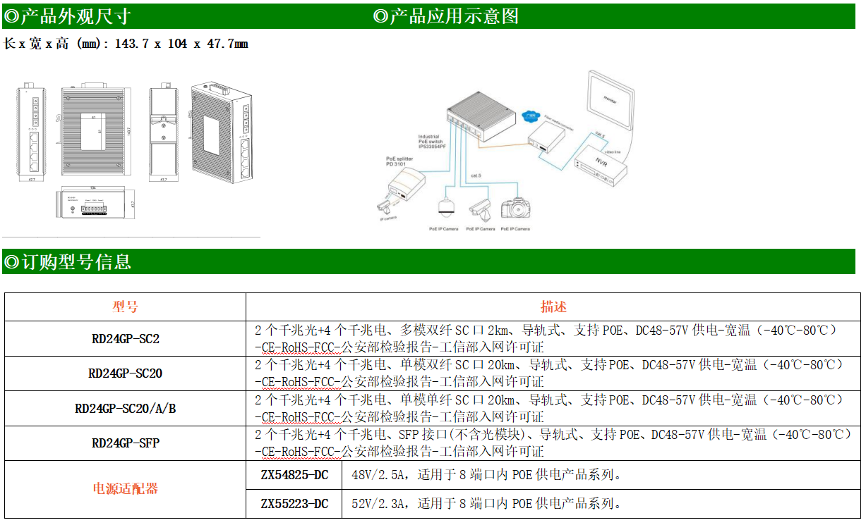 4路千兆POE電口+2路千兆FX光口工業(yè)級以太網(wǎng)POE交換機,支持4個10/100/1000Base-TX電口和2個1000Base-X光口。產(chǎn)品符合FCC、CE、ROHS標準。RD24GP-SFP交換機具有-40℃~80℃的工作溫度,具有超強的堅固度能適應(yīng)各種嚴苛環(huán)境,也可以非常方便的安置在空間緊湊的控制箱中。導(dǎo)軌的安裝特性、寬溫操作及擁有IP40防護等級的外殼及LED指示燈,使RD24GP-SFP成為一個即插即用的工業(yè)級設(shè)備,為用戶的以太網(wǎng)設(shè)備聯(lián)網(wǎng)提供可靠、便捷的解決方案。