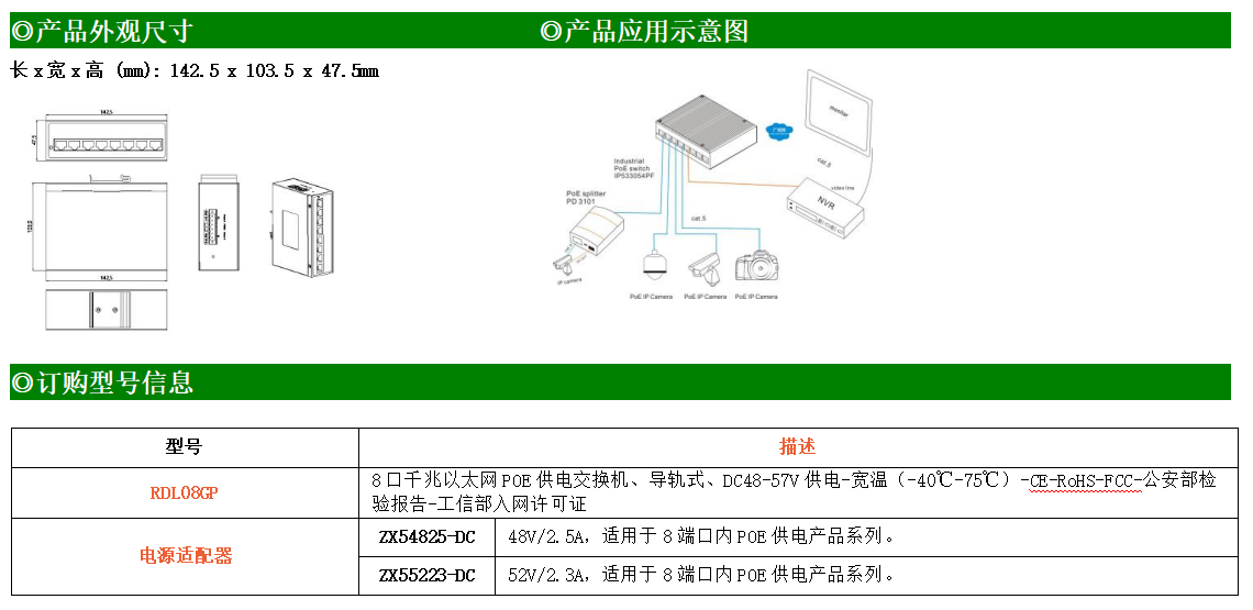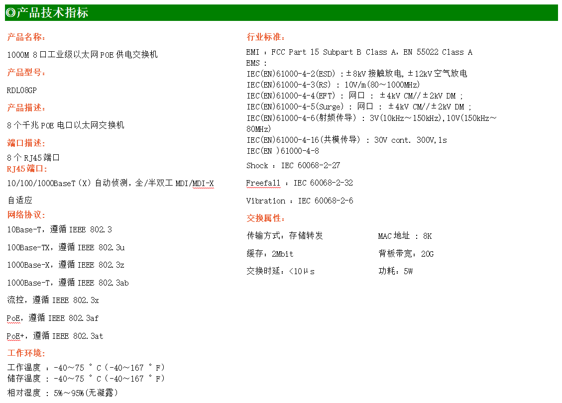 8路千兆電口工業級以太網交換機,支持8個10Base-T/100Base-TX/1000Base-TX POE電口。產品符合FCC、CE、ROHS標準。RDL08GP交換機具有-40℃~75℃的工作溫度,具有超強的堅固度能適應各種嚴苛環境,也可以非常方便的安置在空間緊湊的控制箱中。導軌的安裝特性、寬溫操作及擁有IP40防護等級的外殼及LED指示燈,使RDL08GP成為一個即插即用的工業級設備,為用戶的以太網設備聯網提供可靠、便捷的解決方案。