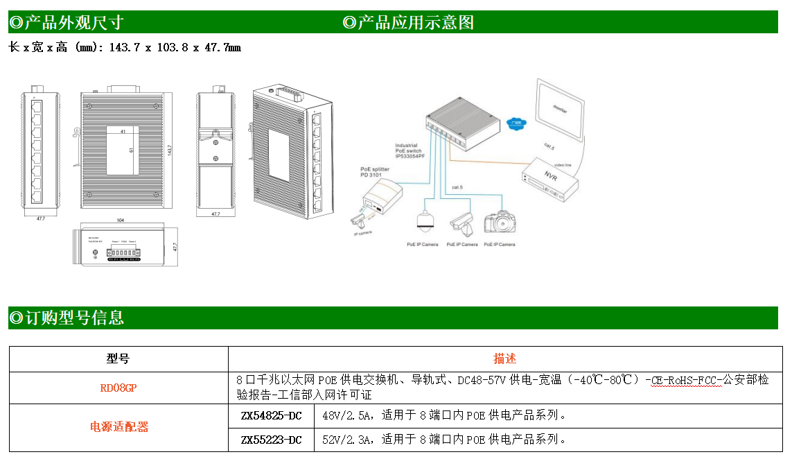 8路千兆電口工業級以太網POE交換機,支持8個100Base-T/1000Base-TX POE電口。產品符合FCC、CE、ROHS標準。RD08GP交換機具有-40℃~80℃的工作溫度,具有超強的堅固度能適應各種嚴苛環境,也可以非常方便的安置在空間緊湊的控制箱中。導軌的安裝特性、寬溫操作及擁有IP40防護等級的外殼及LED指示燈,使RD08GP成為一個即插即用的工業級設備,為用戶的以太網設備聯網提供可靠、便捷的解決方案。