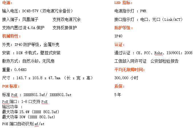 8路千兆POE電口+2路千兆FX光口工業級以太網POE交換機,支持8個10/100/1000Base-TX電口和2個1000Base-X光口。產品符合FCC、CE、ROHS標準。RD28GP-SFP交換機具有-40℃~80℃的工作溫度,具有超強的堅固度能適應各種嚴苛環境,也可以非常方便的安置在空間緊湊的控制箱中。導軌的安裝特性、寬溫操作及擁有IP40防護等級的外殼及LED指示燈,使RD28GP-SFP成為一個即插即用的工業級設備,為用戶的以太網設備聯網提供可靠、便捷的解決方案。