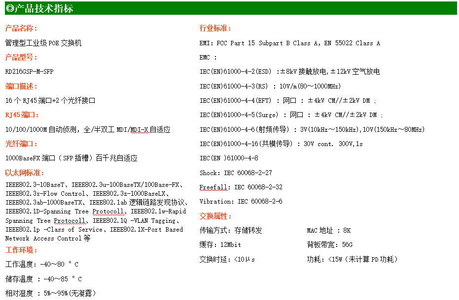 RD216GSP-M是網管型工業以太網POE交換機,產品符合FCC、CE、RoHS標準。支持2個千兆光口和16個千兆POE電口;支持工業現場所需的以太網二層協議,保證通信網絡的穩定性;該系列交換機采用低功耗、無風扇設計,確保無噪聲干擾,同時支持-40~80℃工作溫度和良好的EMC電磁兼容性能,保證在惡劣的工業環境中保持穩定的工作,為工廠自動化,智能交通,視頻監控等工業應用領域組建快速穩定的網絡終端接入網絡提供安全可靠的解決方案。