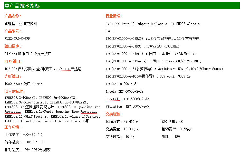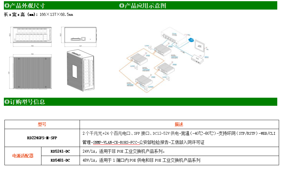 RD224GFS-M是網管型工業以太網交換機,產品符合FCC、CE、RoHS標準。支持2個千兆光口和24個百兆電口;支持工業現場所需的以太網二層協議,保證通信網絡的穩定性;該系列交換機采用低功耗、無風扇設計,確保無噪聲干擾,同時支持-40~80℃工作溫度和良好的EMC電磁兼容性能,保證在惡劣的工業環境中保持穩定的工作,為工廠自動化,智能交通,視頻監控等工業應用領域組建快速穩定的網絡終端接入網絡提供安全可靠的解決方案。