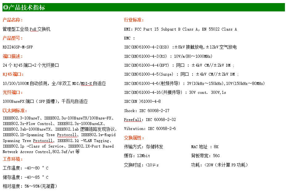 RD224GS-M-SFP是網管型工業以太網交換機,產品符合FCC、CE、RoHS標準。支持2個千兆光口和24個千兆電口,其中16個電口支持PoE供電;支持工業現場所需的以太網二層協議,保證通信網絡的穩定性;該系列交換機采用低功耗、無風扇設計,確保無噪聲干擾,同時支持-40~80℃工作溫度和良好的EMC電磁兼容性能,保證在惡劣的工業環境中保持穩定的工作,為工廠自動化,智能交通,視頻監控等工業應用領域組建快速穩定的網絡終端接入網絡提供安全可靠的解決方案。