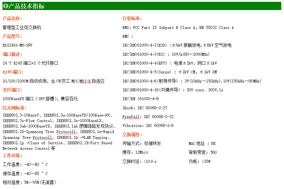 RD224GSP-MU-SFP是網管型工業以太網PoE交換機,產品符合FCC、CE、RoHS標準。可提供24個千兆PoE端口,所有PoE端口符合IEEE802.3af/at標準。支持工業現場所需的以太網二層協議,保證通信網絡的穩定性;該系列交換機采用低功耗、無風扇設計,確保無噪聲干擾,同時支持-40~70℃工作溫度和良好的EMC電磁兼容性能,保證在惡劣的工業環境中保持穩定的工作,為工廠自動化,智能交通,視頻監控等工業應用領域組建快速穩定的網絡終端接入網絡提供安全可靠的解決方案
