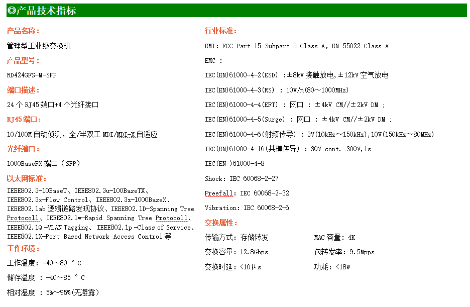 RD424GFS-M是網管型工業以太網交換機,產品符合FCC、CE、RoHS標準。支持2個千兆光口和24個百兆電口;支持工業現場所需的以太網二層協議,保證通信網絡的穩定性;該系列交換機采用低功耗、無風扇設計,確保無噪聲干擾,同時支持-40~80℃工作溫度和良好的EMC電磁兼容性能,保證在惡劣的工業環境中保持穩定的工作,為工廠自動化,智能交通,視頻監控等工業應用領域組建快速穩定的網絡終端接入網絡提供安全可靠的解決方案。