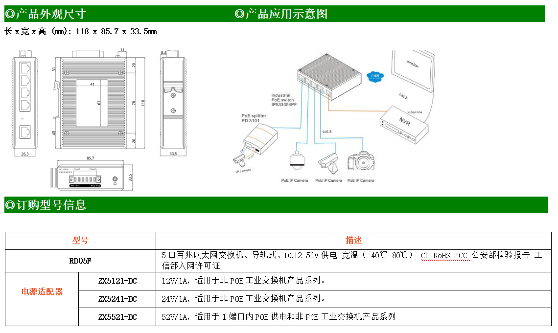 1路百兆上聯(lián)電口+4路百兆下聯(lián)電口工業(yè)級(jí)以太網(wǎng)交換機(jī),支持1個(gè)10/100Base-TX上聯(lián)電口和4個(gè)10Base-T/100Base-TX下聯(lián)電口。產(chǎn)品符合FCC、CE、ROHS標(biāo)準(zhǔn)。RD05F交換機(jī)具有-40℃~80℃的工作溫度,具有超強(qiáng)的堅(jiān)固度能適應(yīng)各種嚴(yán)苛環(huán)境,也可以非常方便的安置在空間緊湊的控制箱中。導(dǎo)軌的安裝特性、寬溫操作及擁有IP40防護(hù)等級(jí)的外殼及LED指示燈,使RD05F成為一個(gè)即插即用的工業(yè)級(jí)設(shè)備,為用戶的以太網(wǎng)設(shè)備聯(lián)網(wǎng)提供可靠、便捷的解決方案。