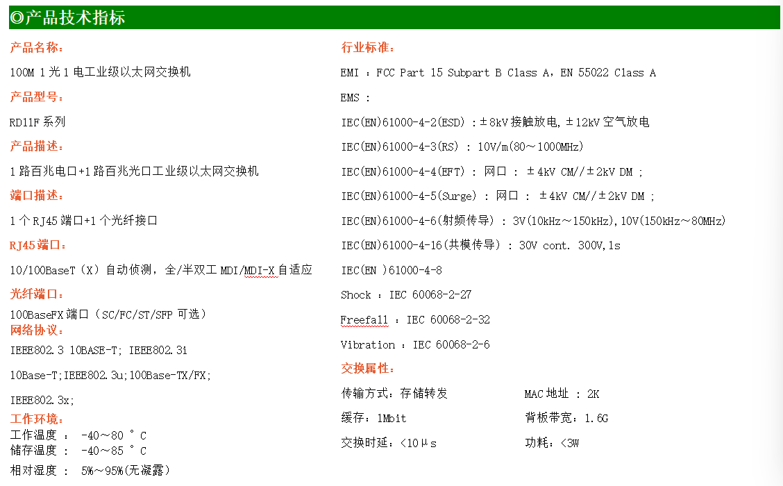 1路百兆電口+1路百兆FX光口工業(yè)級(jí)以太網(wǎng)交換機(jī),支持1個(gè)10Base-T/100Base-TX電口和1個(gè)100Base-X光口。產(chǎn)品符合FCC、CE、ROHS標(biāo)準(zhǔn)。RD11F系列交換機(jī)具有-40℃~80℃的工作溫度,具有超強(qiáng)的堅(jiān)固度能適應(yīng)各種嚴(yán)苛環(huán)境,也可以非常方便的安置在空間緊湊的控制箱中。導(dǎo)軌的安裝特性、寬溫操作及擁有IP40防護(hù)等級(jí)的外殼及LED指示燈,使RD11F成為一個(gè)即插即用的工業(yè)級(jí)設(shè)備,為用戶的以太網(wǎng)設(shè)備聯(lián)網(wǎng)提供可靠、便捷的解決方案。