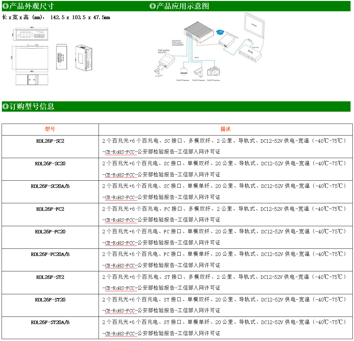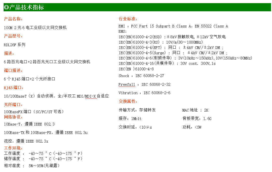 6路百兆電口+2路百兆FX光口工業(yè)級以太網(wǎng)交換機(jī),支持6個10Base-T/100Base-TX電口和2個100Base-X光口。產(chǎn)品符合FCC、CE、ROHS標(biāo)準(zhǔn)。RDL26F系列交換機(jī)具有-40℃~75℃的工作溫度,具有超強(qiáng)的堅固度能適應(yīng)各種嚴(yán)苛環(huán)境,也可以非常方便的安置在空間緊湊的控制箱中。導(dǎo)軌的安裝特性、寬溫操作及擁有IP40防護(hù)等級的外殼及LED指示燈,使RDL26F成為一個即插即用的工業(yè)級設(shè)備,為用戶的以太網(wǎng)設(shè)備聯(lián)網(wǎng)提供可靠、便捷的解決方案。