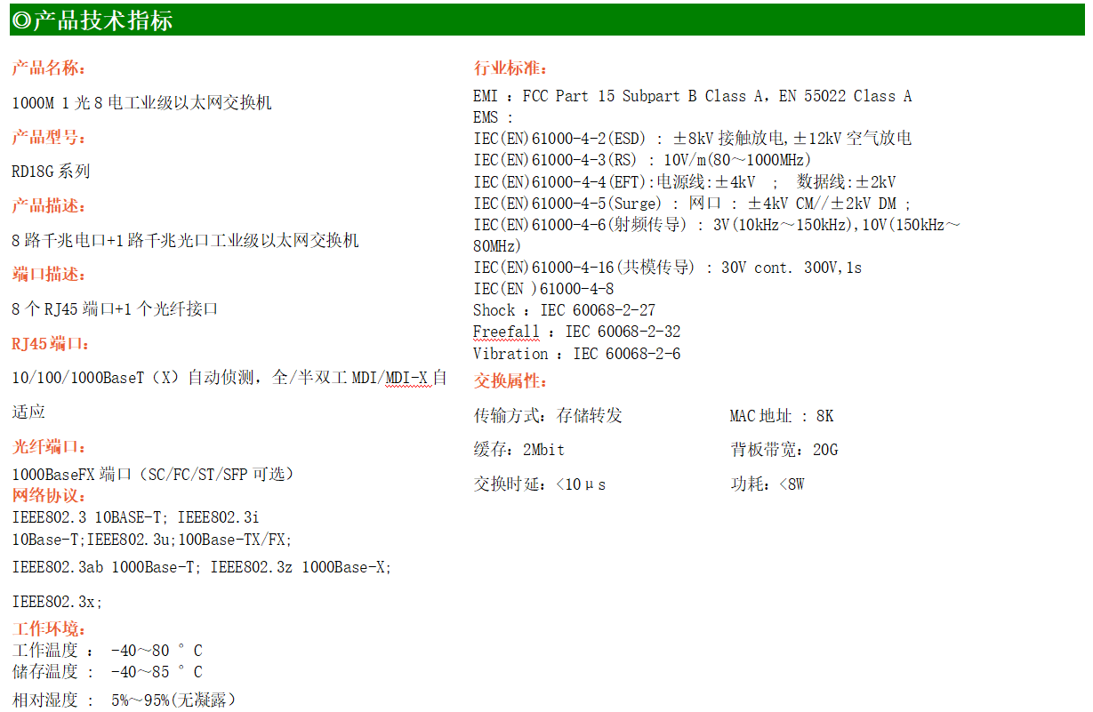 8路千兆電口+1路千兆FX光口工業級以太網交換機,支持8個100Base-T/1000Base-TX電口和1個1000Base-X光口。產品符合FCC、CE、ROHS標準。RD18G系列交換機具有-40℃~80℃的工作溫度,具有超強的堅固度能適應各種嚴苛環境,也可以非常方便的安置在空間緊湊的控制箱中。導軌的安裝特性、寬溫操作及擁有IP40防護等級的外殼及LED指示燈,使RD18G系列成為一個即插即用的工業級設備,為用戶的以太網設備聯網提供可靠、便捷的解決方案。