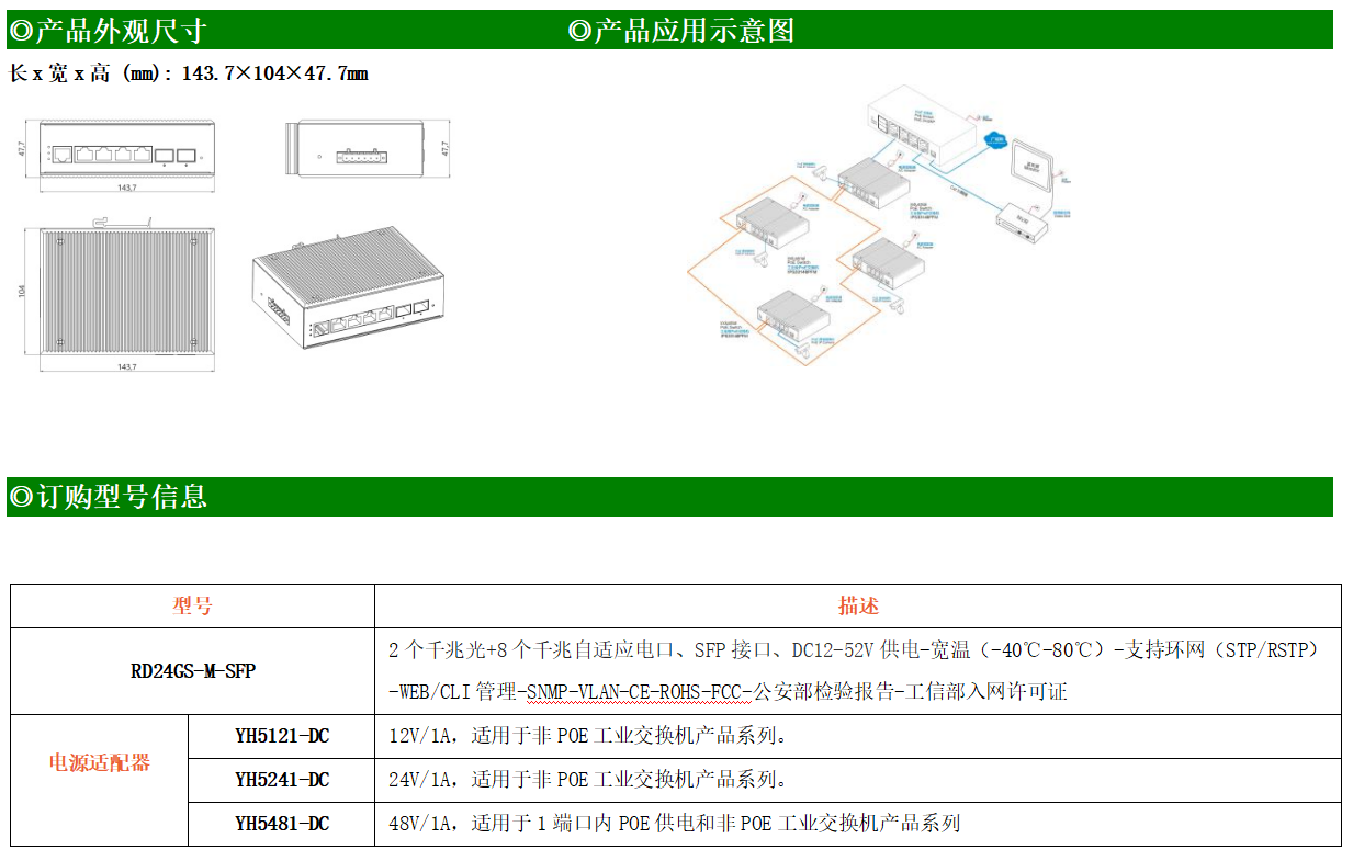 RD24GS-M是網管型工業以太網交換機,產品符合FCC、CE、RoHS標準。支持2個千兆光口和4個千兆電口;支持工業現場所需的以太網二層協議,保證通信網絡的穩定性;該系列交換機采用低功耗、無風扇設計,確保無噪聲干擾,同時支持-40~80℃工作溫度和良好的EMC電磁兼容性能,保證在惡劣的工業環境中保持穩定的工作,為工廠自動化,智能交通,視頻監控等工業應用領域組建快速穩定的網絡終端接入網絡提供安全可靠的解決方案。