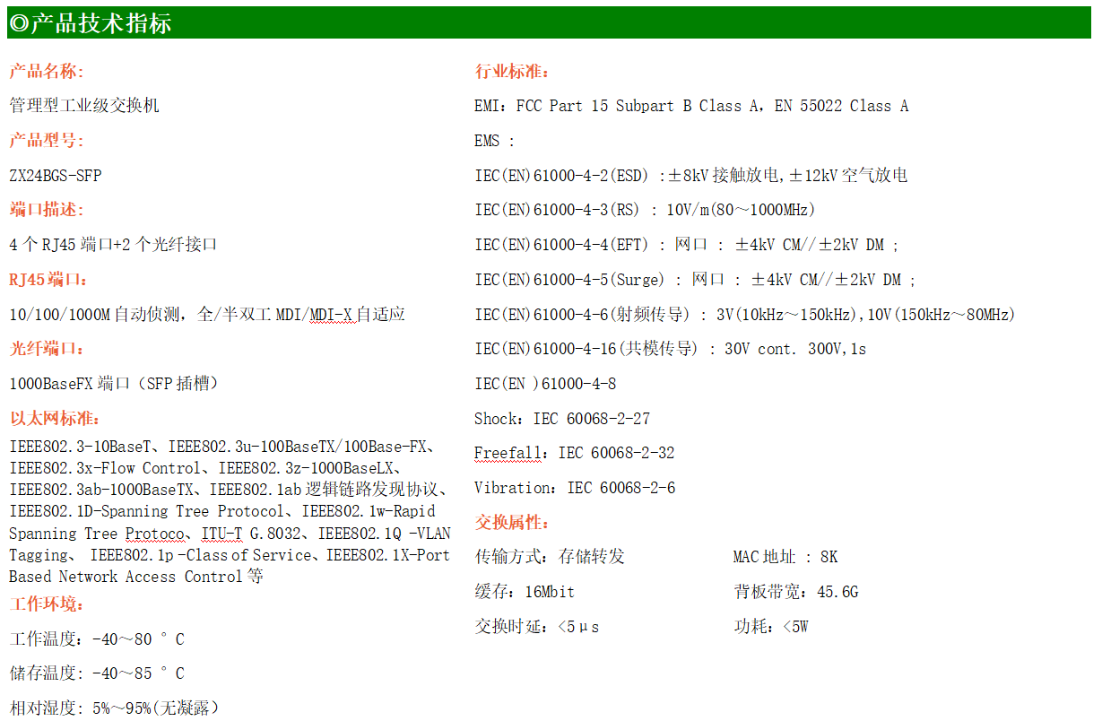 ZX24BGS-SFP是網(wǎng)管型工業(yè)以太網(wǎng)交換機(jī),產(chǎn)品符合FCC、CE、ROHS標(biāo)準(zhǔn)。支持2個(gè)千兆光口和4個(gè)千兆電口,支持一路console口;支持工業(yè)現(xiàn)場所需的以太網(wǎng)二層協(xié)議,保證通信網(wǎng)絡(luò)的穩(wěn)定性;該系列交換機(jī)采用低功耗、無風(fēng)扇設(shè)計(jì),確保無噪聲干擾,同時(shí)支持-40~85℃工作溫度和良好的EMC電磁兼容性能,保證在惡劣的工業(yè)環(huán)境中保持穩(wěn)定的工作,為工廠自動(dòng)化,智能交通,視頻監(jiān)控等工業(yè)應(yīng)用領(lǐng)域組建快速穩(wěn)定的網(wǎng)絡(luò)終端接入網(wǎng)絡(luò)提供安全可靠的解決方案。