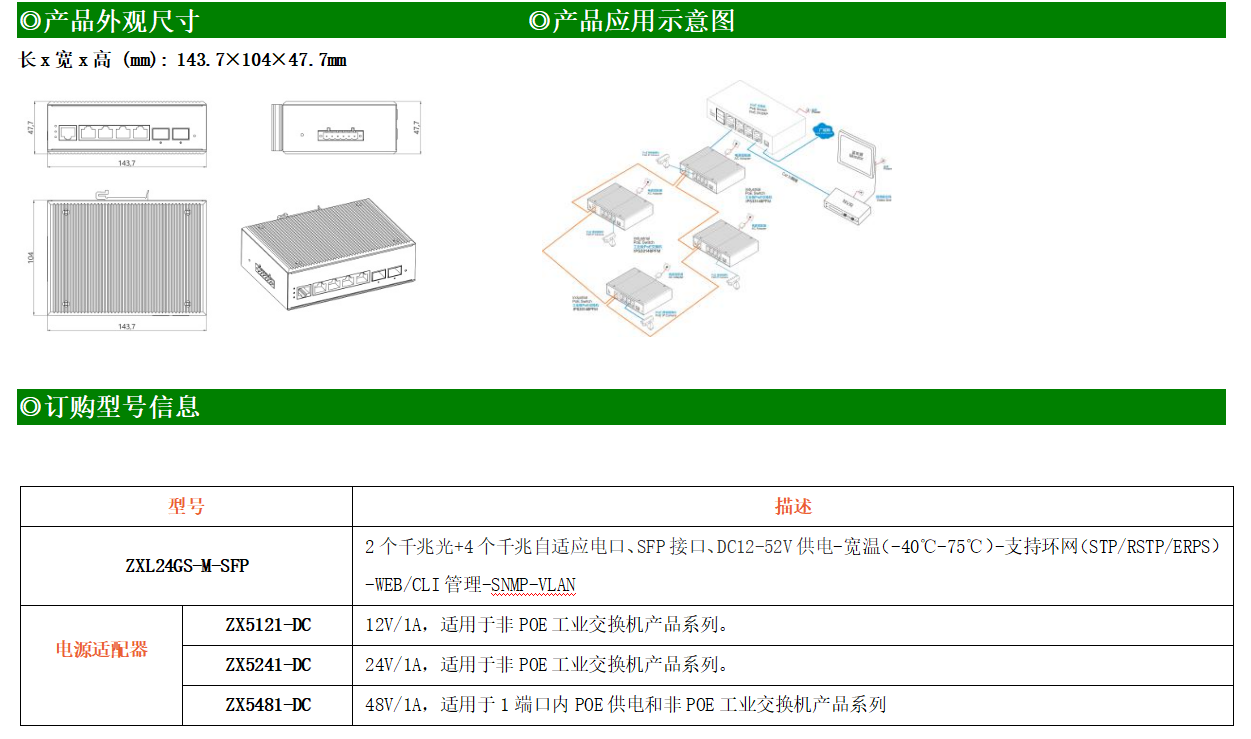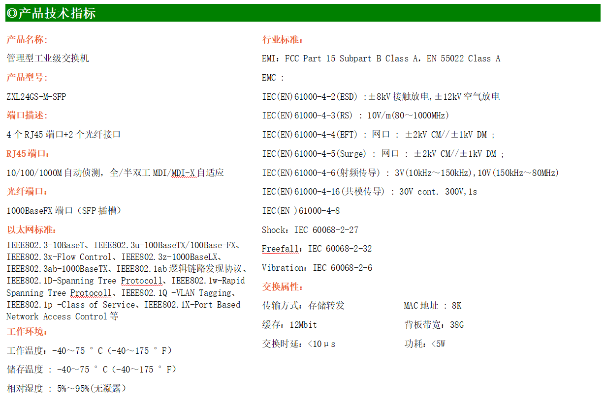 ZXL24GS-M是網管型工業以太網交換機,產品符合FCC、CE、RoHS標準。支持2個千兆光口和4個千兆電口;支持工業現場所需的以太網二層協議,保證通信網絡的穩定性;該系列交換機采用低功耗、無風扇設計,確保無噪聲干擾,同時支持-40~75℃工作溫度和良好的EMC電磁兼容性能,保證在惡劣的工業環境中保持穩定的工作,為工廠自動化,智能交通,視頻監控等工業應用領域組建快速穩定的網絡終端接入網絡提供安全可靠的解決方案。