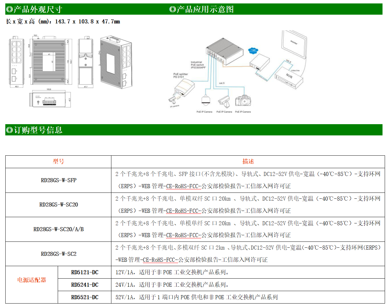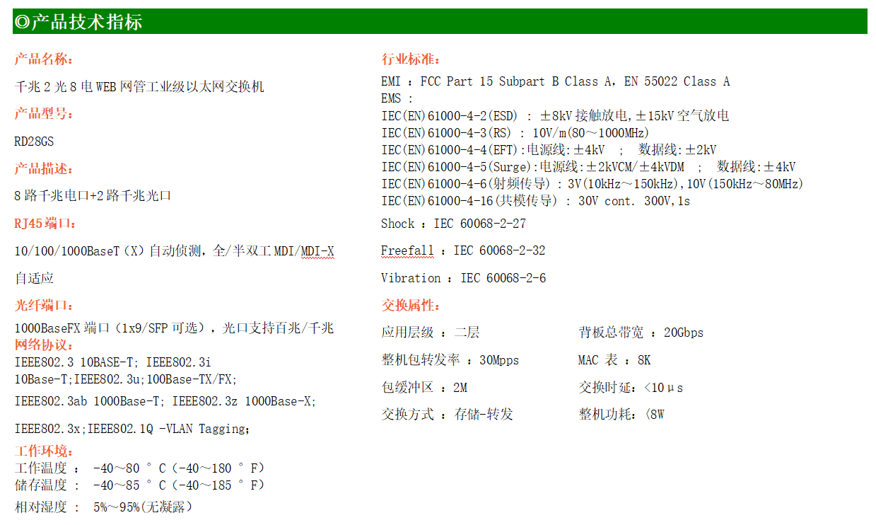 RD28GS-W-SFP系列WEB網管工業級以太網交換機,產品符合FCC、CE、ROHS標準,支持工業現場所需的以太網二層協議,保證通信網絡的穩定性。該系列交換機采用低功耗、無風扇設計,確保無噪聲干擾,同時支持-40~85℃工作溫度和良好的EMC電磁兼容性能,保證在惡劣的工業環境中保持穩定的工作,為工廠自動化,智能交通,視頻監控等工業應用領域組建快速穩定的網絡終端接入網絡提供安全可靠的解決方案。
