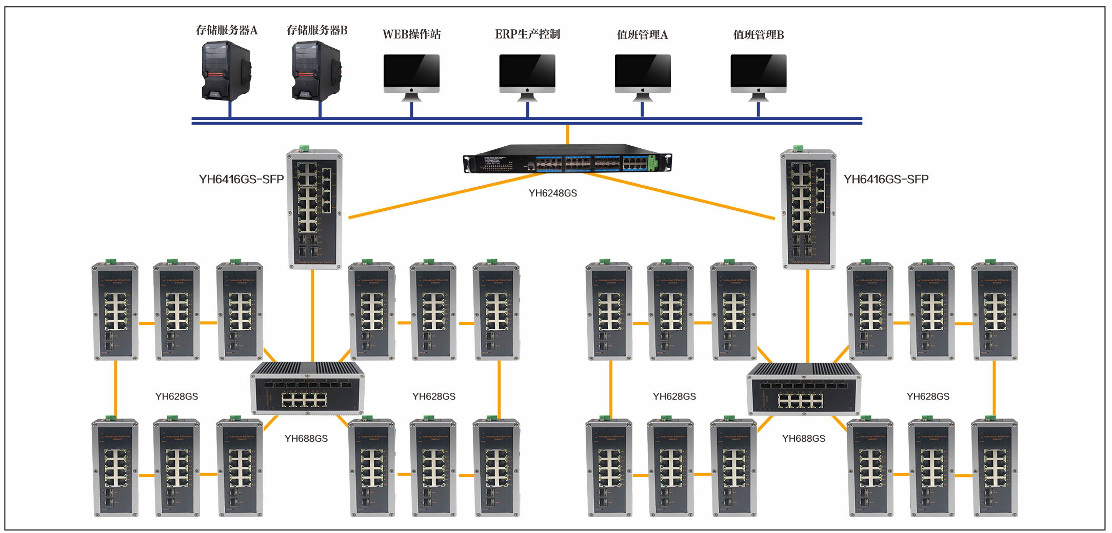宇航在鋼鐵自動(dòng)化生產(chǎn)線監(jiān)控解決方案中采用了YH6248GS-SFP,YH688GS,YH6416GS-SFP工業(yè)以太網(wǎng)交換機(jī)構(gòu)筑各個(gè)車(chē)間內(nèi)部通信網(wǎng)絡(luò),在車(chē)間內(nèi)部通過(guò)YH628GS千兆工業(yè)以太網(wǎng)構(gòu)筑環(huán)網(wǎng),針對(duì)實(shí)際的站點(diǎn)進(jìn)行合理的分布,通過(guò)虛擬局域網(wǎng)技術(shù)對(duì)各個(gè)車(chē)間之間的數(shù)據(jù)進(jìn)行邏輯隔離,保證通信的安全性。